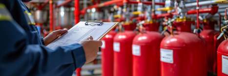 Ein Mitarbeiter überprüft akribisch die Funktion und Dokumentation von Brandschutzanlagen zur Gewährleistung der Sicherheit.
