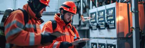 Facharbeiter inspizieren elektrische Schaltanlagen für Sicherheit, Funktionalität und Energieeffizienz in industriellen Umgebungen.